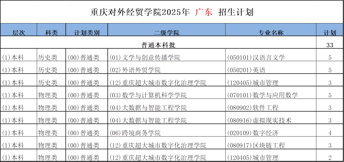重庆对外经贸学院2025年福建-广西-广东招生计划