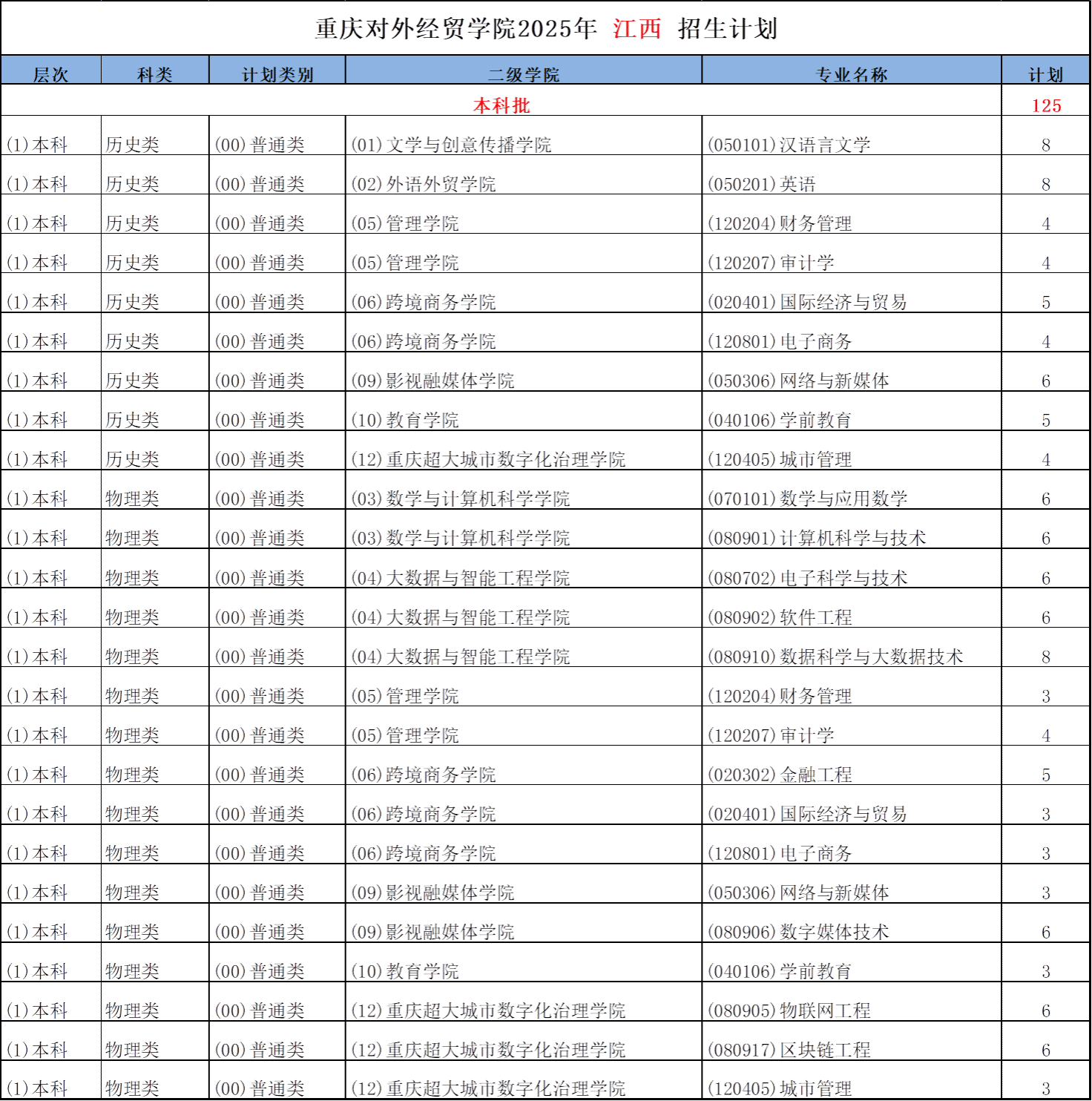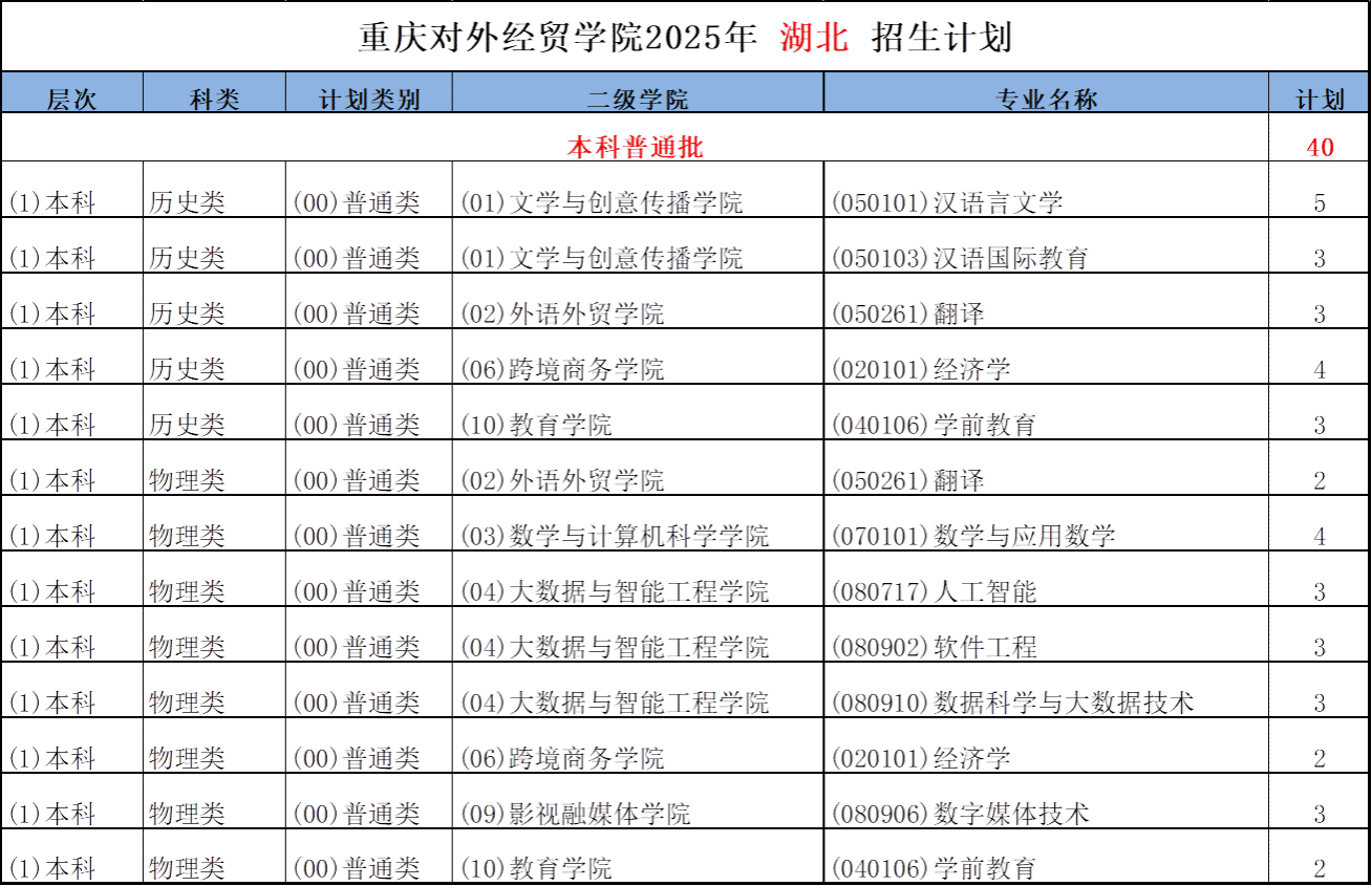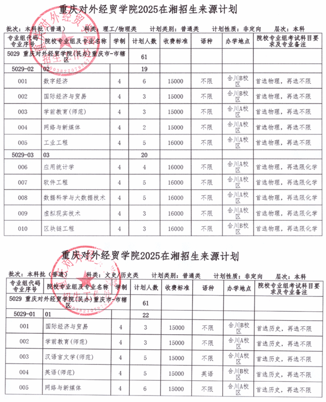 重庆对外经贸学院2025年湖南-湖北-江西招生计划