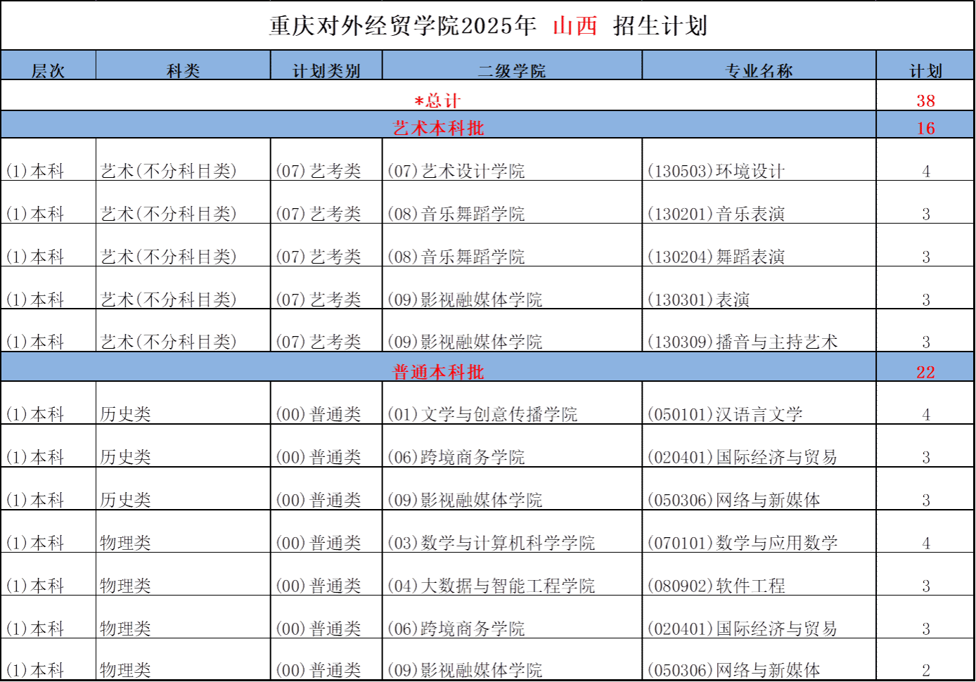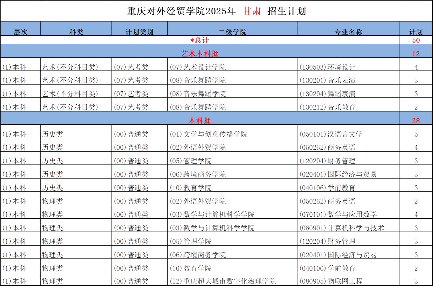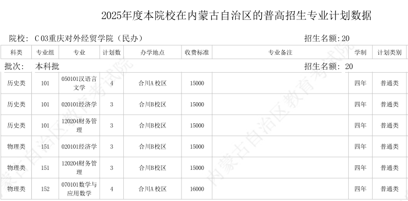 重庆对外经贸学院2025年甘肃-山西-内蒙古招生计划
