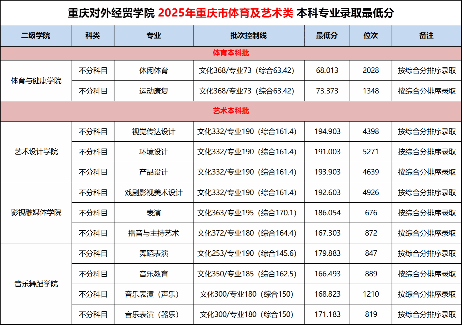 重庆对外经贸学院2025年重庆艺术及体育本科专业录取分数